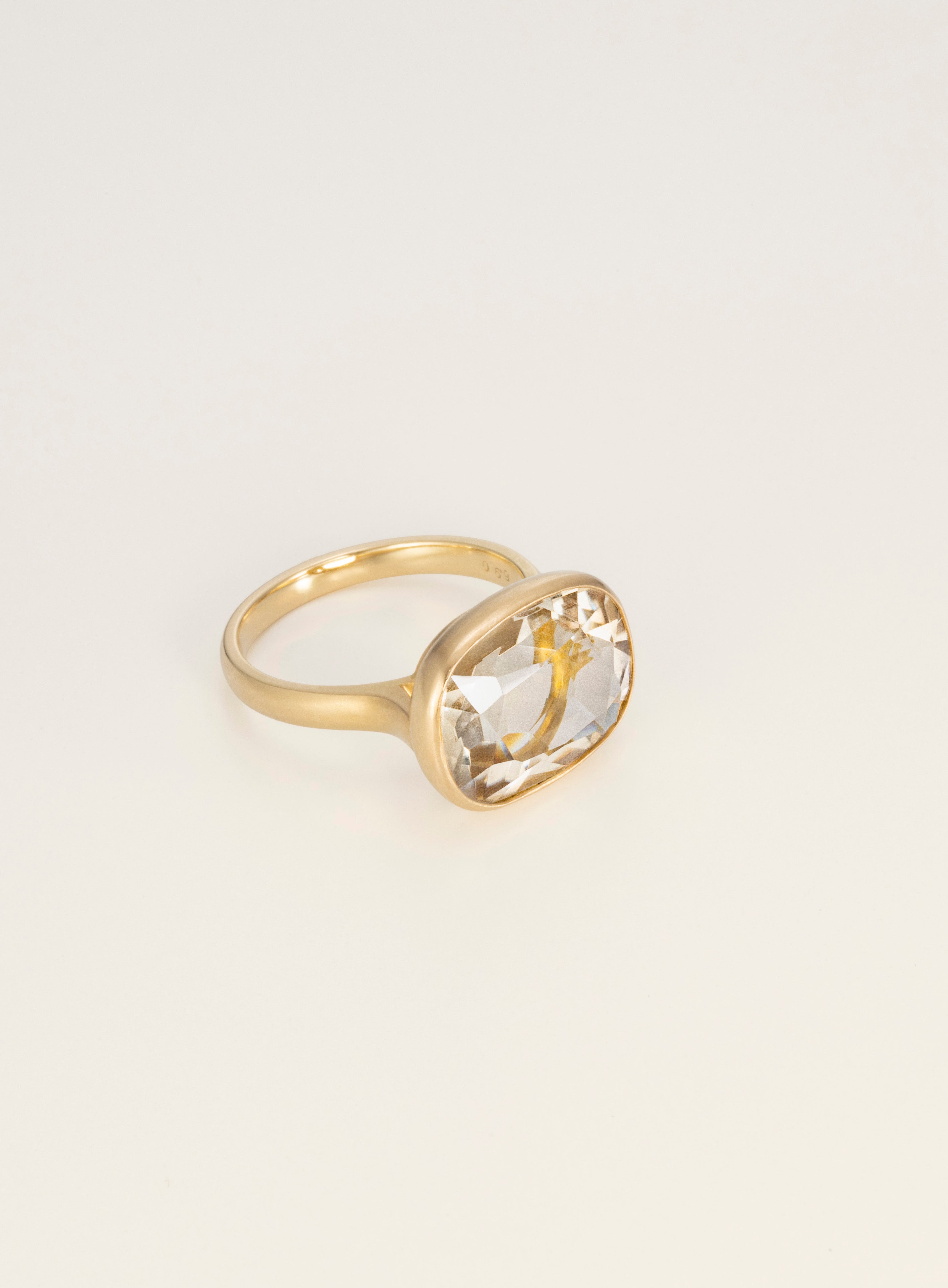 こどもの頃、駄菓子屋で買ったもらったキャンディリング。それをイメージしてできた唯一無二のデザイン。大粒でカラフルな石はどれひとつとして同じものはなく自分だけの石。その石に想いを馳せお守りがわりに身につけ続けていただきたい。