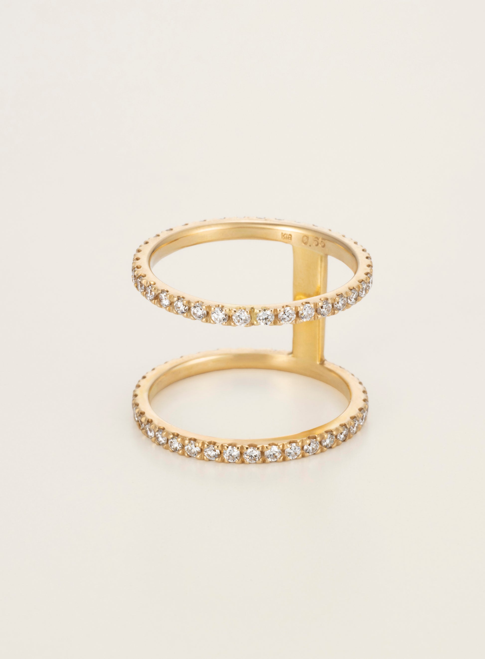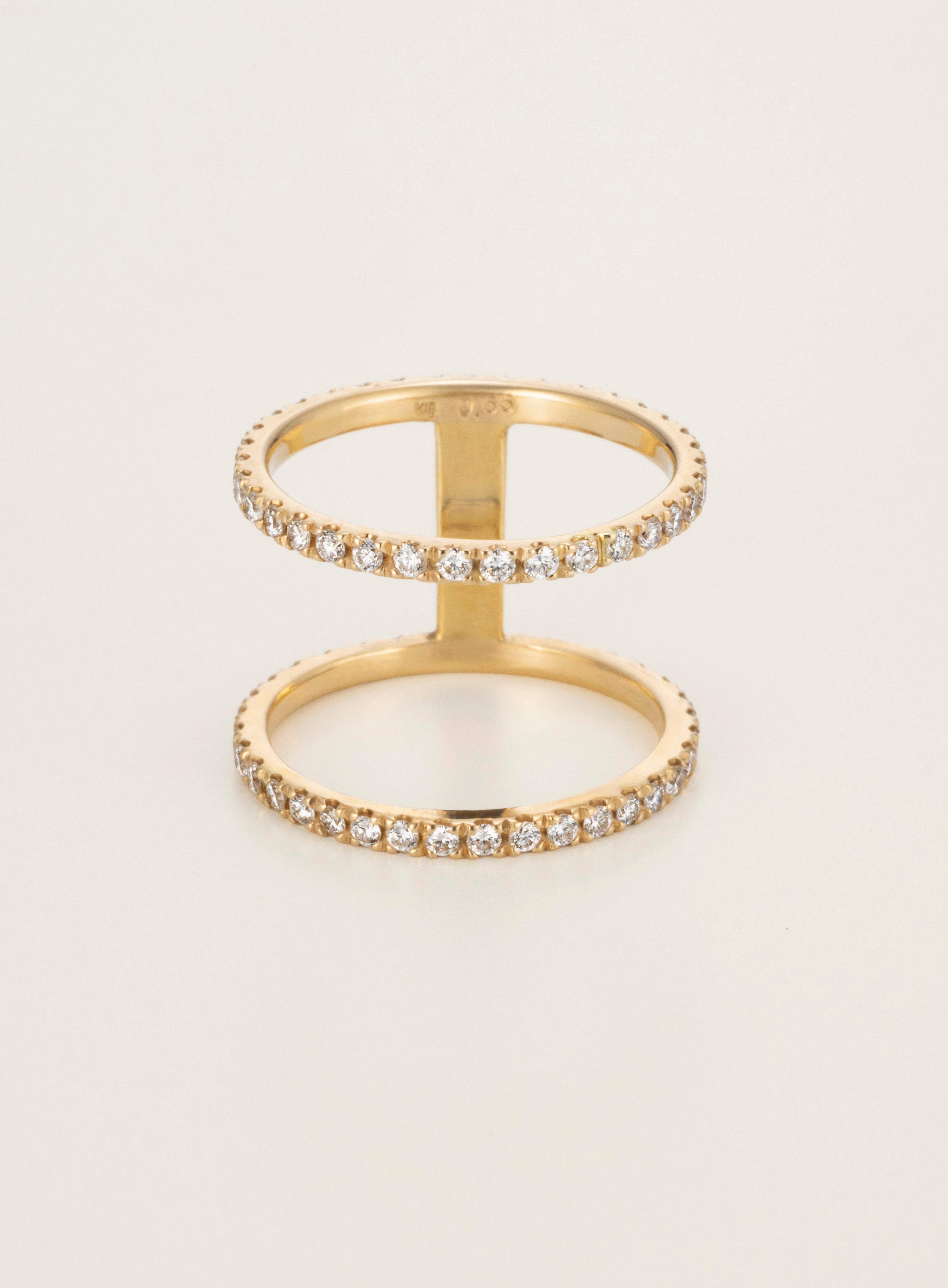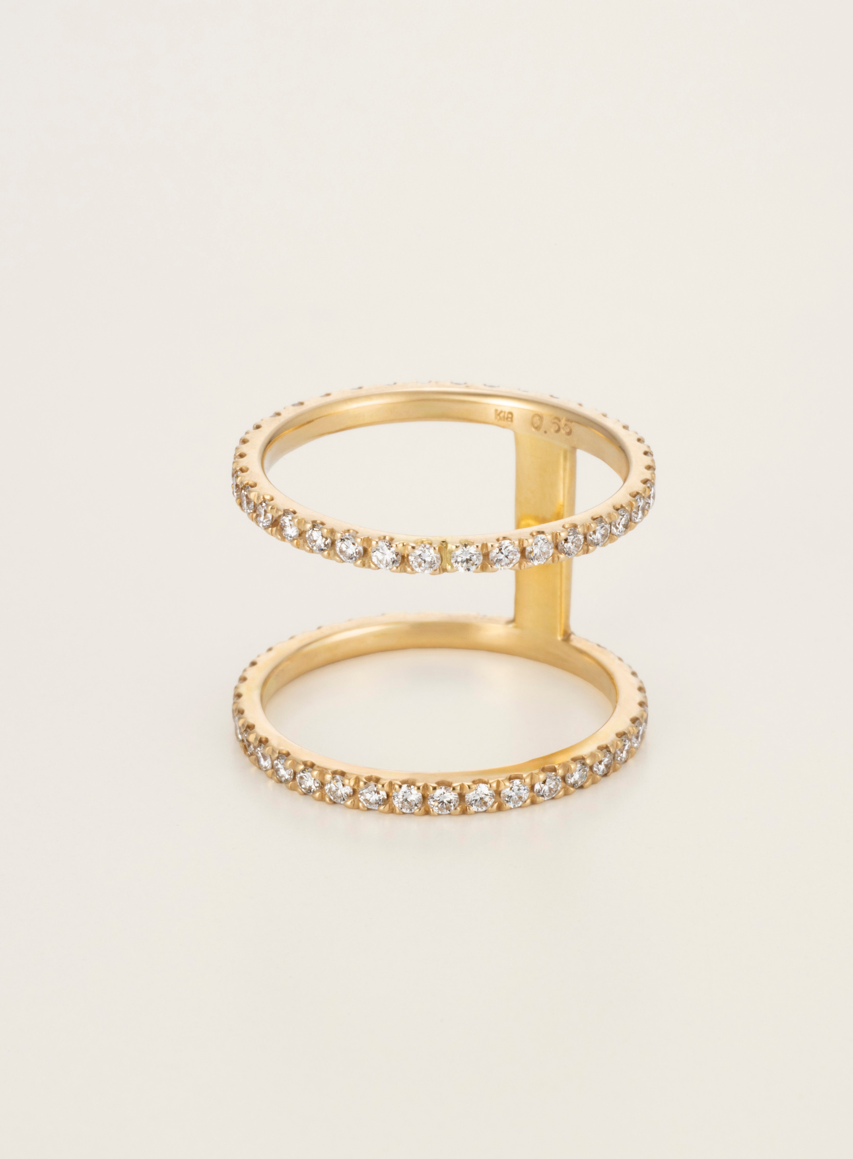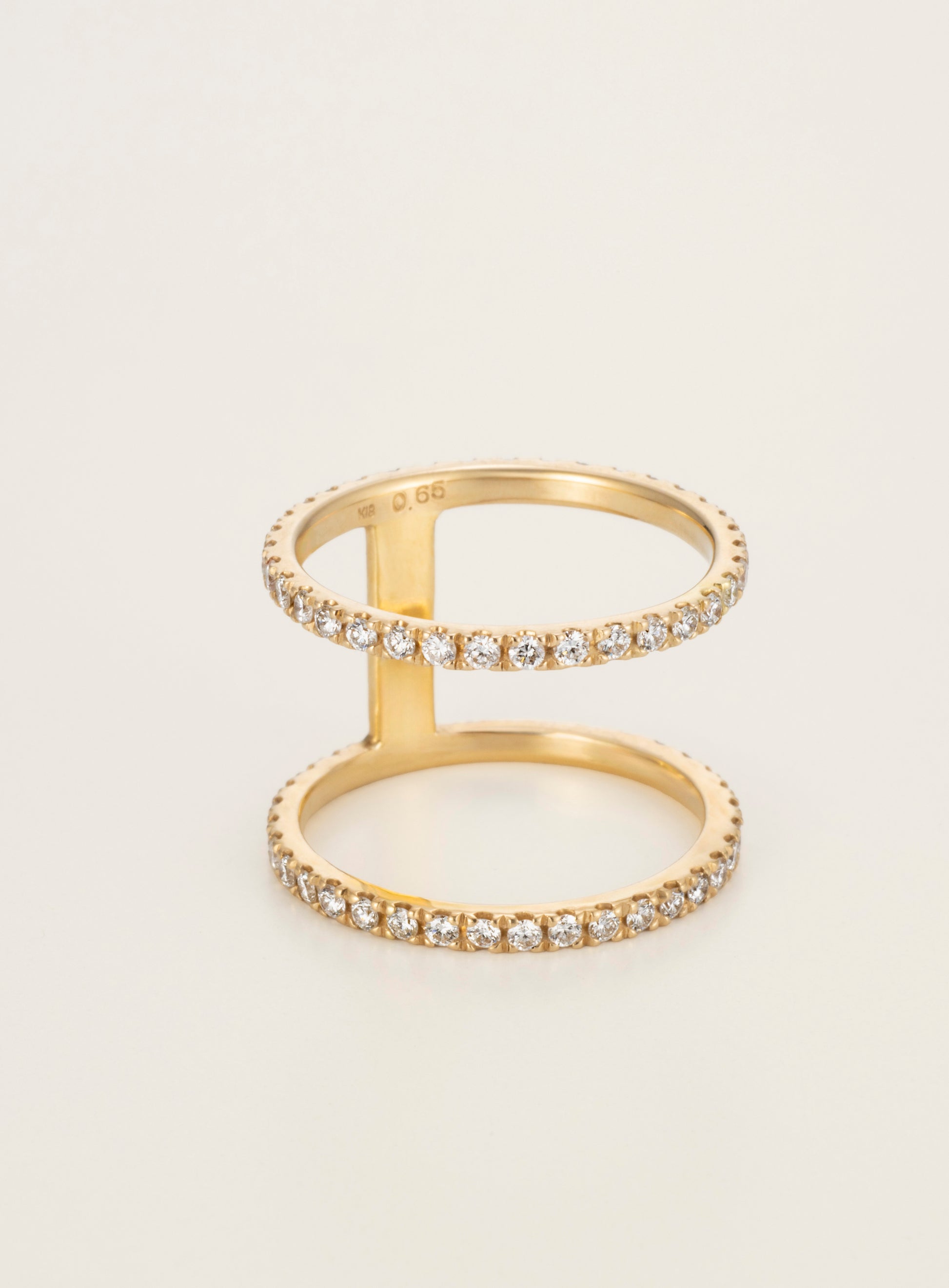 まるで「One」のRingを二本重ねているようなデザイン。ハイグレードなDiamondの煌めきが存在感を放ち、二本のリングを結ぶ縦のゴールド部分を外側に向けると、また別の表情に出会えます。ぜひ「One」と一緒にシリーズコーデを楽しんでいただきたいアイテムです。